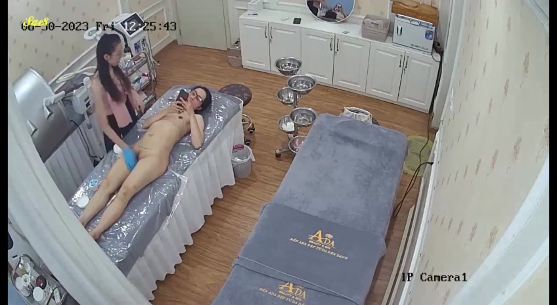 黑客破解美容院监控摄像头偷拍气质眼镜少妇脱光光做SPA纤体美容。